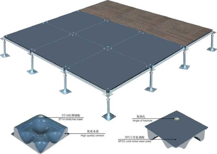 The panel is made of high-quality cold-rolled hard steel plate, and the bottom plate is made of deep-drawn steel plate. After the upper and lower steel plates are stamped and spot welded, they are treated with phosphating and spraying. The middle hollow shell is filled with high-quality high-strength foamed cement, which forms a stable load after curing. Structure, with corner keyholes at the four corners, the minimum ideal finish height can be 6CM, on the basis of standard network floor, you can add wire slots around according to actual usage requirements for wiring!